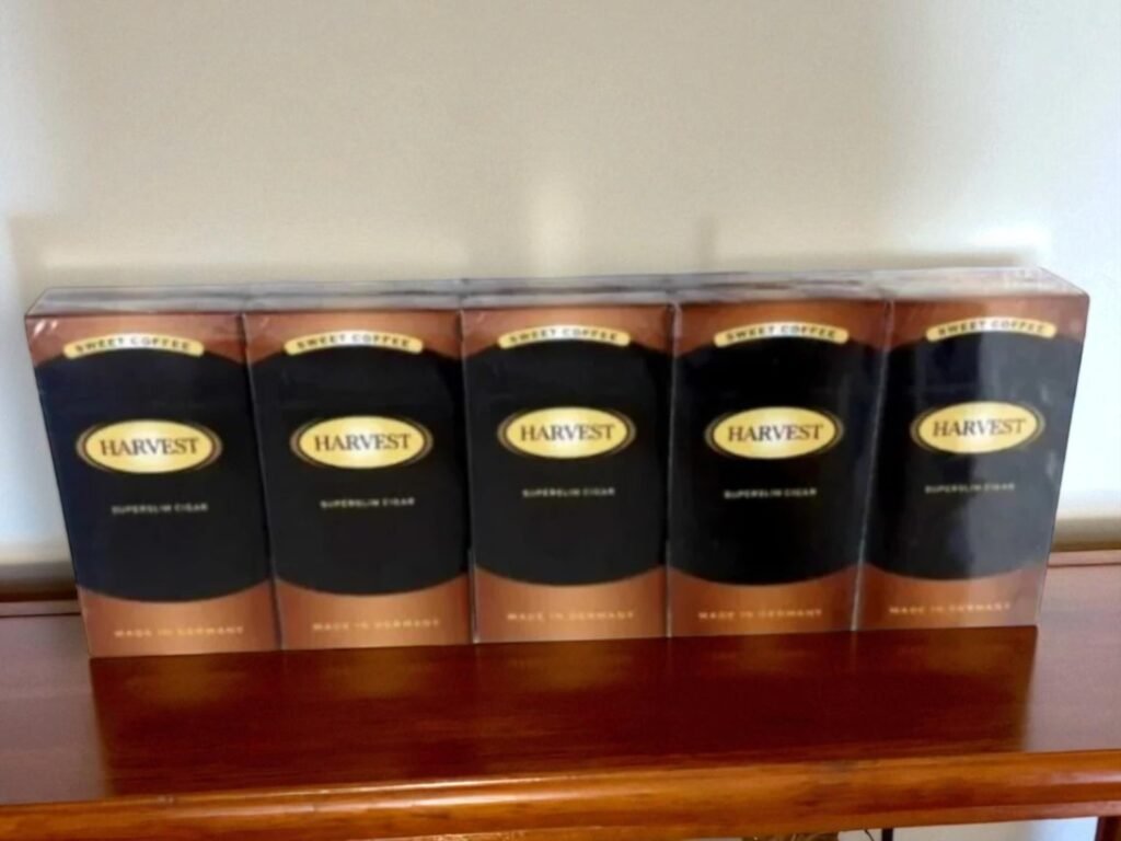 Harvest Sweet Coffee บุหรี่สายหวานที่มีกลิ่นกาแฟเข้มข้น ทาร์ 10 มก. นิโคติน 0.8 มก. ขนาดมวนปกติ ผลิตในประเทศเยอรมัน เหมาะสำหรับผู้ที่ชื่นชอบรสชาติหวานผสมกลิ่นกาแฟ บรรจุ 1 คอตตอน มี 10 ซอง ซองละ 10 มวน